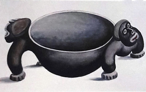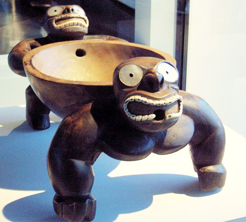 Plat à kava étonnant avec ses grandes gueules garnies de dents de sanglier et ses yeux de nacre, on en trouve un exemplaire similaire et remarquable au British Museum (Oc, HAW.46 – cf photo ci-dessous). Ce dernier avait été donné à Clerke lors du dernier voyage. Clerke n’en fit pas don au gouverneur du Kamtchatka, et sa collection personnelle rejoignit rapidement le chemin des collections de Joseph Banks. Du coup le plat se retrouva au célèbre musée dès 1780.