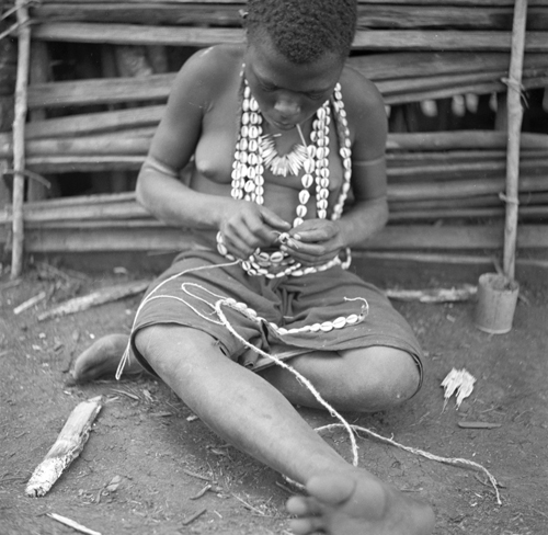 Photo 3 : Une jeune fille Anga fabriquant un collier de coquillage, Manki, Morobe Province, © Beatrice Blackwood, Novembre 1936. © Pitt Rivers Museum 1998.334.117.