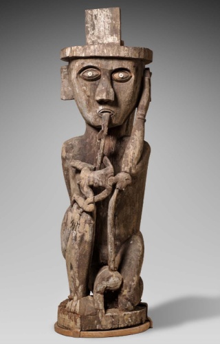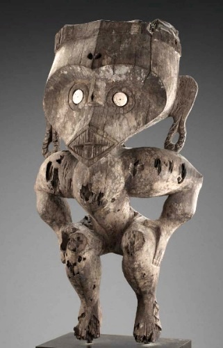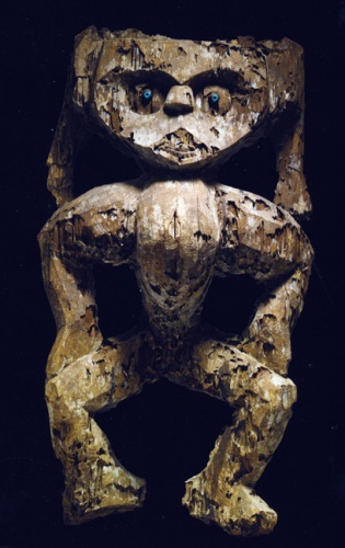 Chez les Kenyah, on a affaire, avec les deux statues ci-dessous (collectées par Emile Deletaille dans les années 70) à un autre style, moins tranquille, une figure plus « féroce », la langue tirée, motif récurrent dans la statuaire Dayak en signe d’agressivité.