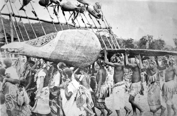 Afin de compléter quelques éléments sur les sociétés Tolai, mentionnons encore l'existence d'une autre société "secrète" appelée Iniet. Celle-ci avait créé de nombreux artefacts cérémoniels connus collectivement sous le nom de pokopoko. Les palettes de danse (bair) étaient portés par deux par des hommes lors d'une danse (cf. la photographie ci-dessous). Les personnages qui figurent... Lire la Suite →