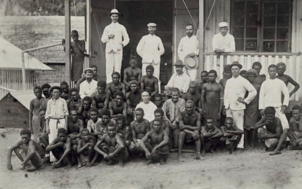 Photo 2 : Employés de la société commerciale de Hambourg Hernsheim & Co. à Matupi, Nouvelle-Bretagne, vers 1890. Le directeur général Max Thiel se tient sur la véranda tenant son chapeau dans une main, © Musée des archives Völkerkunde, Hambourg.