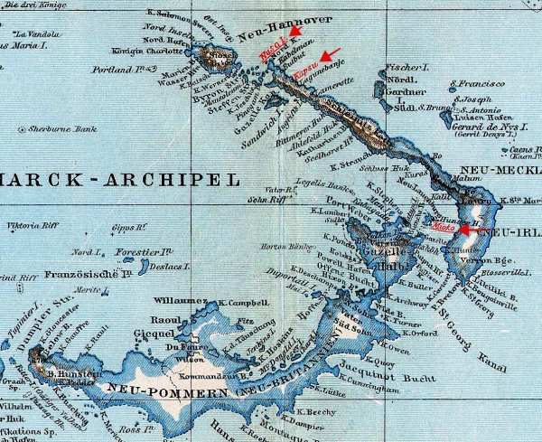 Après nos discussions à Friedrich Wilhemshafen, nous décidâmes d’un commun accord (en réalité « arraché », car Luca était resté sourd à mes réticences) de partir pour la Nouvelle-Bretagne malgré le peu d’argent qui nous restait. Luca attendait beaucoup, peut-être trop, de l’entretien avec Thiel. Le jour du printemps 1894, nous débarquâmes ainsi à Herbertshöhe, toute nouvelle capitale de l’administration coloniale de la Nouvelle-Bretagne.