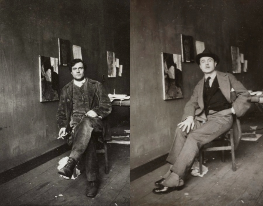 Photo 1 : Anonyme, Modigliani dans son atelier, rue Ravignan 1915, Paris, musée de l’Orangerie © RMN-Grand Palais © Dominique Couto et à droite : Photo 2 : Anonyme, Paul Guillaume dans l’atelier de Modigliani, non daté, Paris, musée de l’Orangerie © RMN-Grand Palais © Franck Raux.