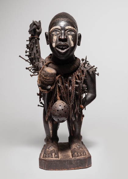 Photo 6 : Statue Nkisi Nkonde, Kongo, Bassin du Fleuve Congo, R. D. C. – 44 cm, Bois, clous, fer, tissu, cordelette, verre, corne, calebasse, pigments, Provenance : Collecté in situ par René Marchal (1898-1971), entre 1922 et 1947 © Martin Doustar
