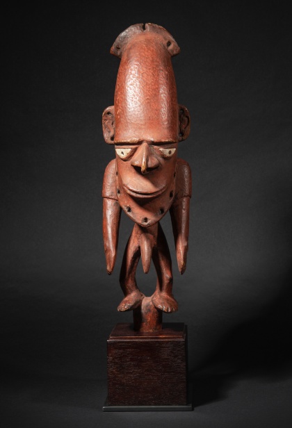 Photo 7 :Bouchon de flûte wusear Biwat/Mundugumor, Yuat River, Papua New Guinea, 19e siècle (C14 dating) – 43cm, Bois tendre patiné brun rougeâtre, yeux incrustés de nacre, Provenance : Collecté par un explorateur, scientifique danois, entre la 1ère et la 2e guerre mondiale, Ex collection School Museum, Hemsterhuisstraat, La Haye, Pays-Bas, retiré du musée probablement dans les années 1970, Ex collection Mon Steyaert, Bruxelles, Ex collection Philipp Konzett, Vienne, Ex collection Adrian Schlag © Danielle Voirin–Galerie Flak