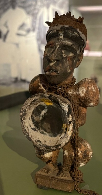 Outre le thème original de l’exposition qui consiste à rappeler l’importance du commerce avec les Kongo et l’importation de multiples objets manufacturés européens, leur intégration dans certaines sculptures peut donc surprendre. Ainsi en est-il de cet accordéon et de cette lampe tempête aux mains de statues funéraires ou plus classiquement de ce fusil porté par la statuette Beembe ci-dessus, vendu sur ce territoire dès les années 1870.