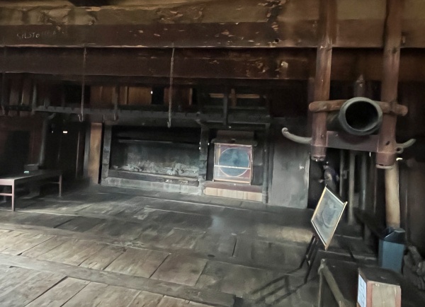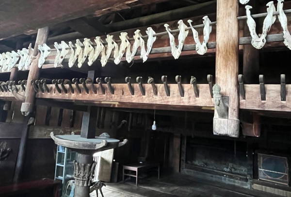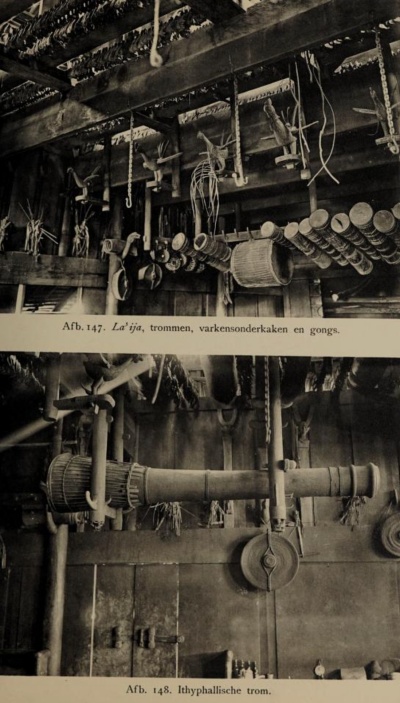 Pour ma part, je n’ai visité que la maison de Bawomataluo, ouverte aux touristes. Outre les invariants de l’architecture, on retrouve quelques éléments de décor ou conservation d’instruments semblables. Ainsi en est-il de ces grands tambours, bien que sur la photographie de Schröder, leur nombre se compte plutôt en dizaines.