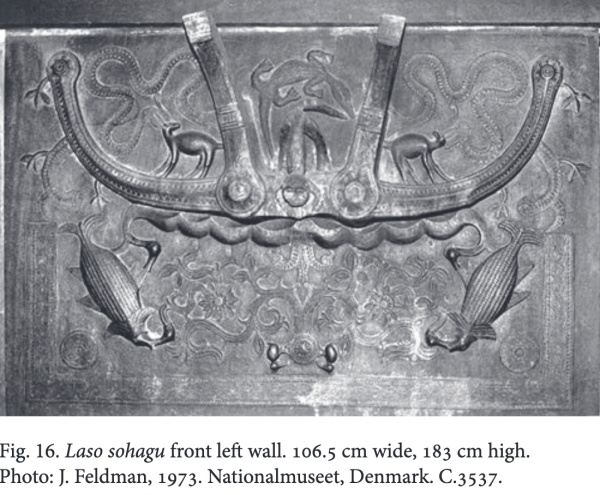 Ces panneaux, appelés laso sohagu, sont assez rares dans les collections ; il semble que chaque maison de chef n’en possédait que deux (exceptionnellement quatre).