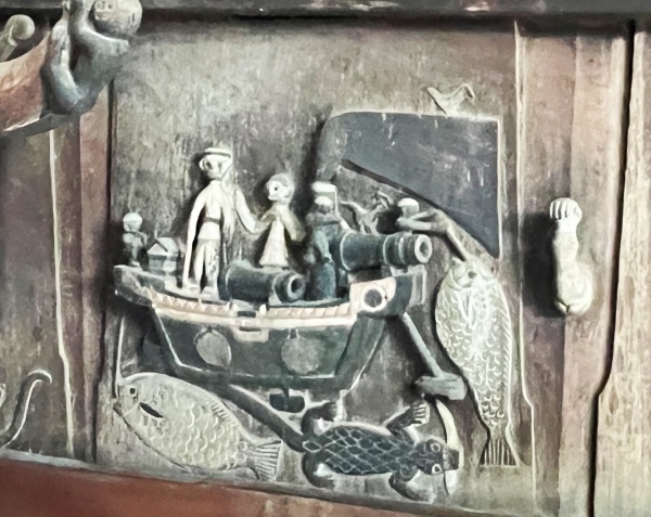 Il existe encore de nos jours des panneaux sculptés. Un étonnant exemplaire montrant un bateau armé, dont j’ignore la signification, était présent lors du passage de Jean-Paul Barbier en 1974 et que nous retrouvons 50 ans après. (Ce dernier précise seulement que les poissons et crocodiles entourant le bateau accompagnent généralement le dieu « mauvais » Laturé Danö (Lowalangi)). Peut-être est-ce une représentation de la force des Néerlandais ?