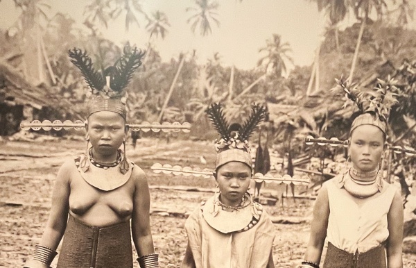 On notera encore le rectangle à cases qui surmonte le saita, ce fameux motif horizontal de la coiffure et qui était lié à la commémoration des fêtes de rang. Dans le panneau de Bawomataluo, (1917 et 2024), il représenterait un coffret à bijoux muni d’une serrure. Totalement différent est le modèle du panneau de Jean-Paul Barbier puisque, plus important, il est gratifié de deux branches moins rigides, garnies de boules à l’extrémité des rameaux… (cf Symbolique et motifs du Sud de Nias).