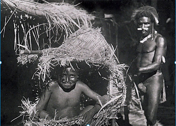 Photo : Ove Eh, un enfant du village d’Ukiravi dans son kaiemunu, dans la maison longue Mira Ravi © Williams, 1922
