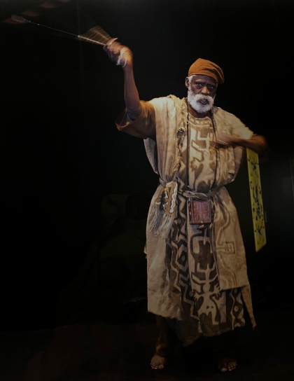 Photo 5 : Hamadoun Kassogué maniant un rhombe (Enregistrement immersif effectué par Renaud Millet-Lacombe et Elsa Desjardins, Lausanne RTS, studio 15, 2024, Production MEG 2025)