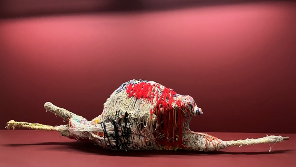 Photo 3 : Sans titre, assemblage d’éléments de récupération, branches de bois, cônes en carton, rubans bolduc, fils de laine, oeuvre de Judith Scott vers 1990.