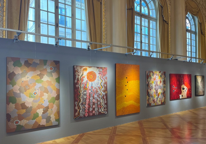 La salle des fêtes de la mairie du 5ème offre un bel écrin à la présentation de la collection de deux passionnés autour d’une centaine d’oeuvres — peintures à l’acrylique sur toile, pigments naturels sur écorce et artefacts.