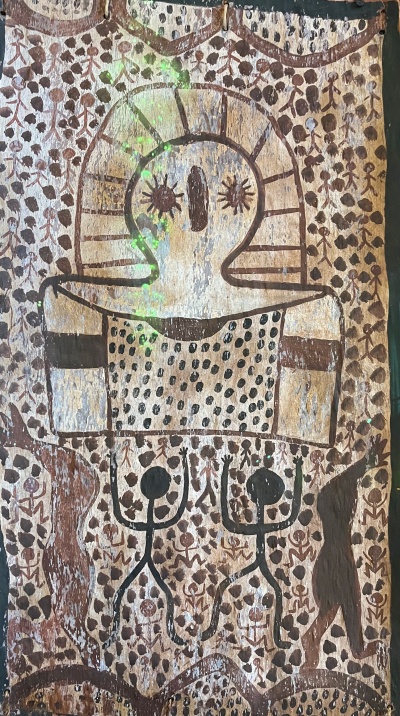 À la sortie, je retrouve la représentation d’un de ces êtres étranges, un wandjina, cette figure ancestrale des peuples du nord-ouest australien, qui incarne à la fois la création, la pluie, le souffle vital et le regard omniprésent. Son visage sans bouche, ses grands yeux ouverts, semblent interroger silencieusement.