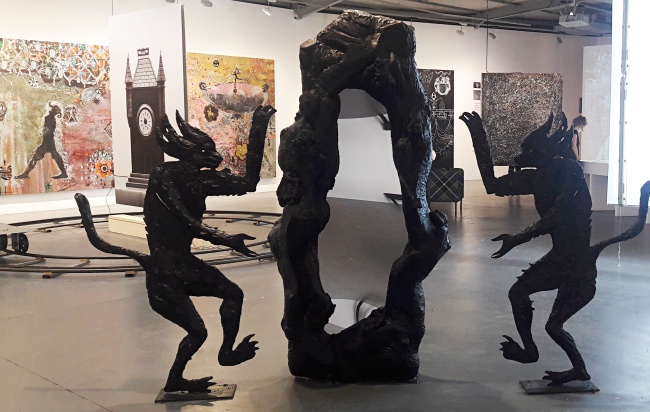 Je garde pour ma part un souvenir très vif de son exposition à La Maison Rouge à l’été 2017. L’impression d’entrer dans un véritable théâtre mental où le pire, le grotesque et le merveilleux cohabitaient. Je revois la traversée du couloir — non pas une œuvre en particulier, mais cette densité qui enveloppait tout — puis la grande salle où d’horribles diables velus nous conviaient à franchir le miroir. Un miroir qui ne renvoyait qu’une image déformée de soi, à la fois repoussante, ridicule et fascinante, si bien que seuls les plus téméraires auraient osé en franchir le seuil vers l’inconnu.