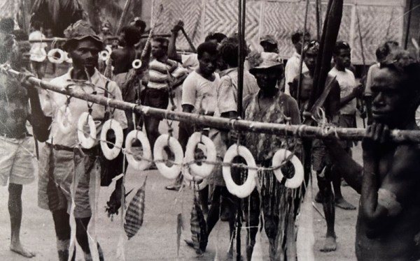 J'évoquais, chez les Arawe, des motifs de boucliers dont l'intérieur représentaient des formes singulières, semblables à celles qui couvrent des étoffes d'écorce.Chez les Nakanai, des motifs de boucliers sont également semblables à ceux des proues de pirogues, des masques et des libers d'écorce. Ces étoffes d'écorce (non pas battue, semble-t-il, mais mâchée) étaient utilisées pour... Lire la Suite →
