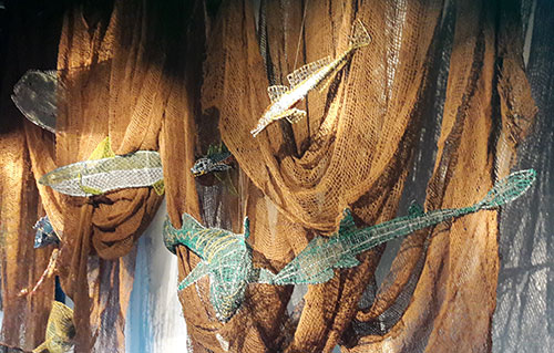 On a vu depuis quelques années émerger ce type de sculptures réalisées à partir de morceaux de filets de pêche abandonnés en mer (ghost nets), se situant à la fois dans une démarche écologique puisqu'il y a récupération de déchets dans lesquels des animaux se retrouvent pris au piège, et une démarche artistique.Géraldine Le Roux,... Lire la Suite →